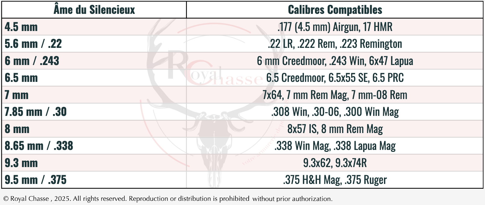 Voici un tableau des calibres courants compatibles en fonction de l’âme d'un silencieux :