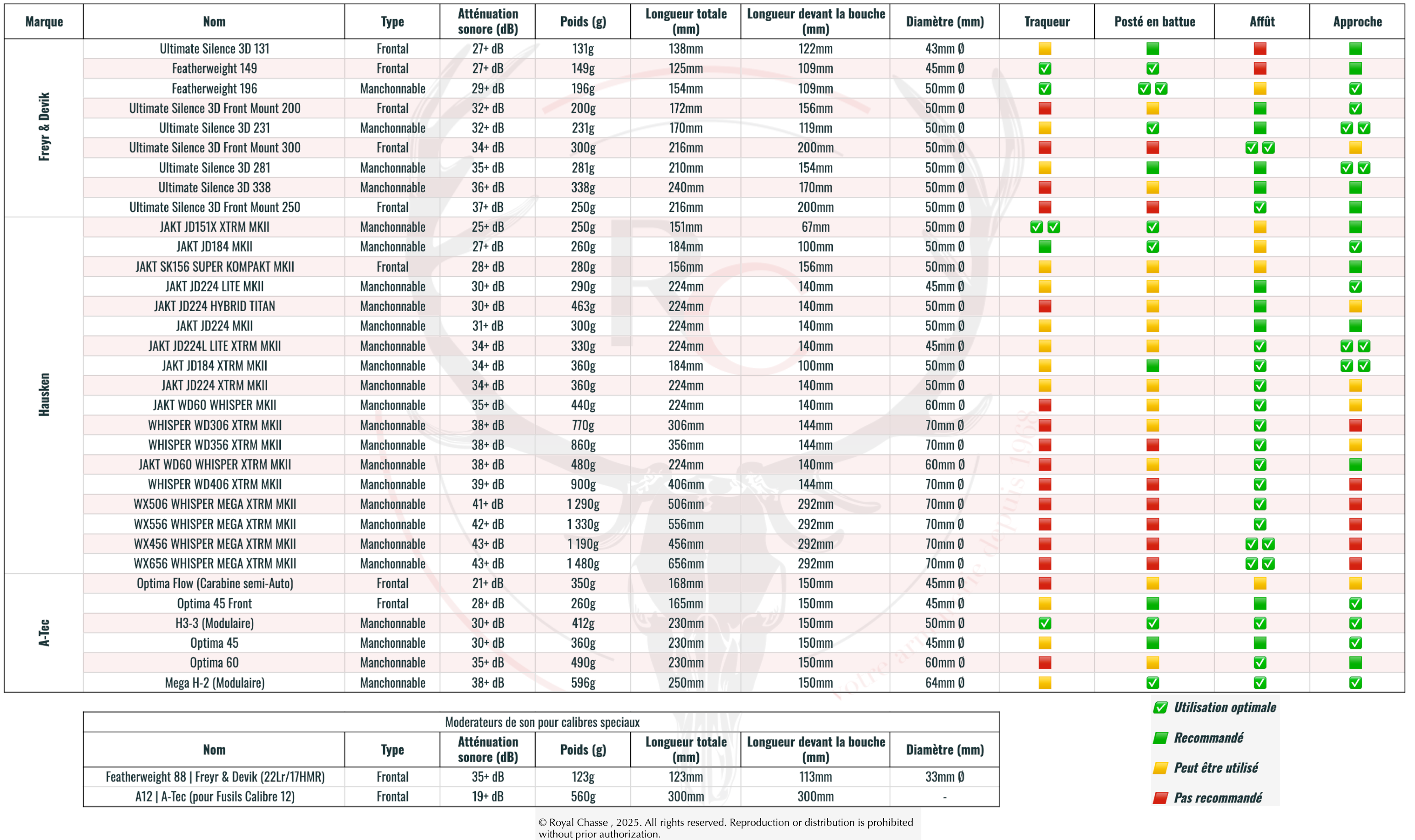 Consultez notre tableau de comparaison des silencieux pour découvrir les caractéristiques détaillées de chaque modèle disponible chez Royal Chasse. Ce guide vous aide à choisir le silencieux qui correspond le mieux à vos besoins ! Les notes attribuées à chaque modérateur en fonction des différentes pratiques de chasse reflètent une interprétation personnelle de leurs atouts spécifiques. (Dernière mise à jour: 12/2024)