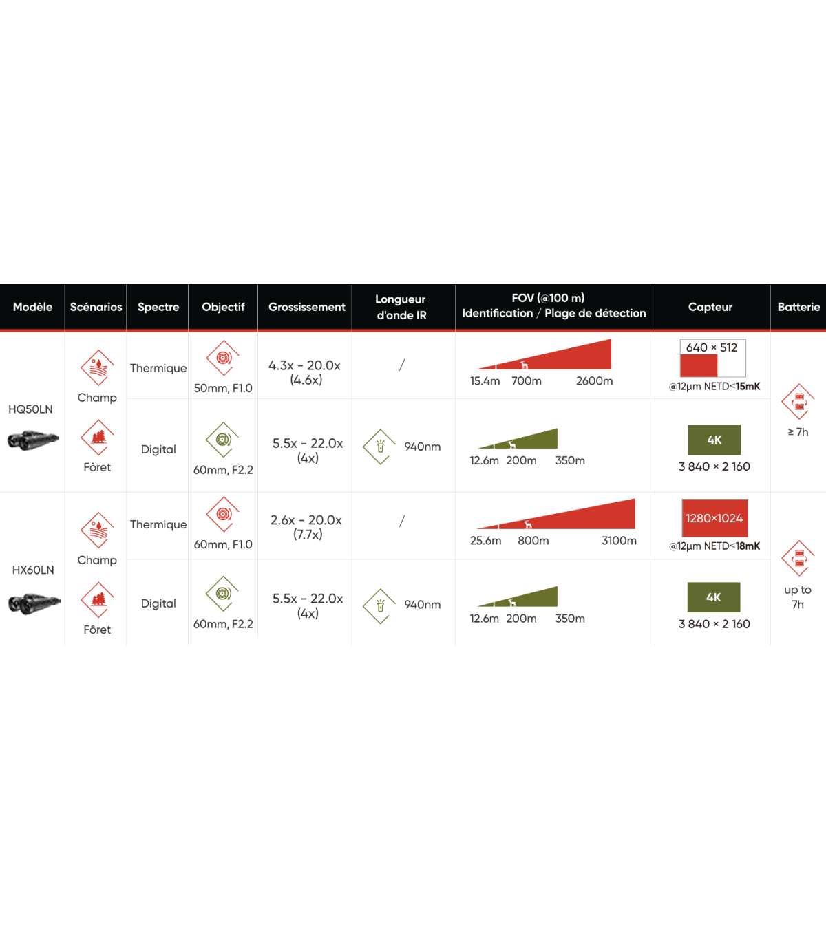 - Champ de vision thermique (H×V) en mètres à 100 m
